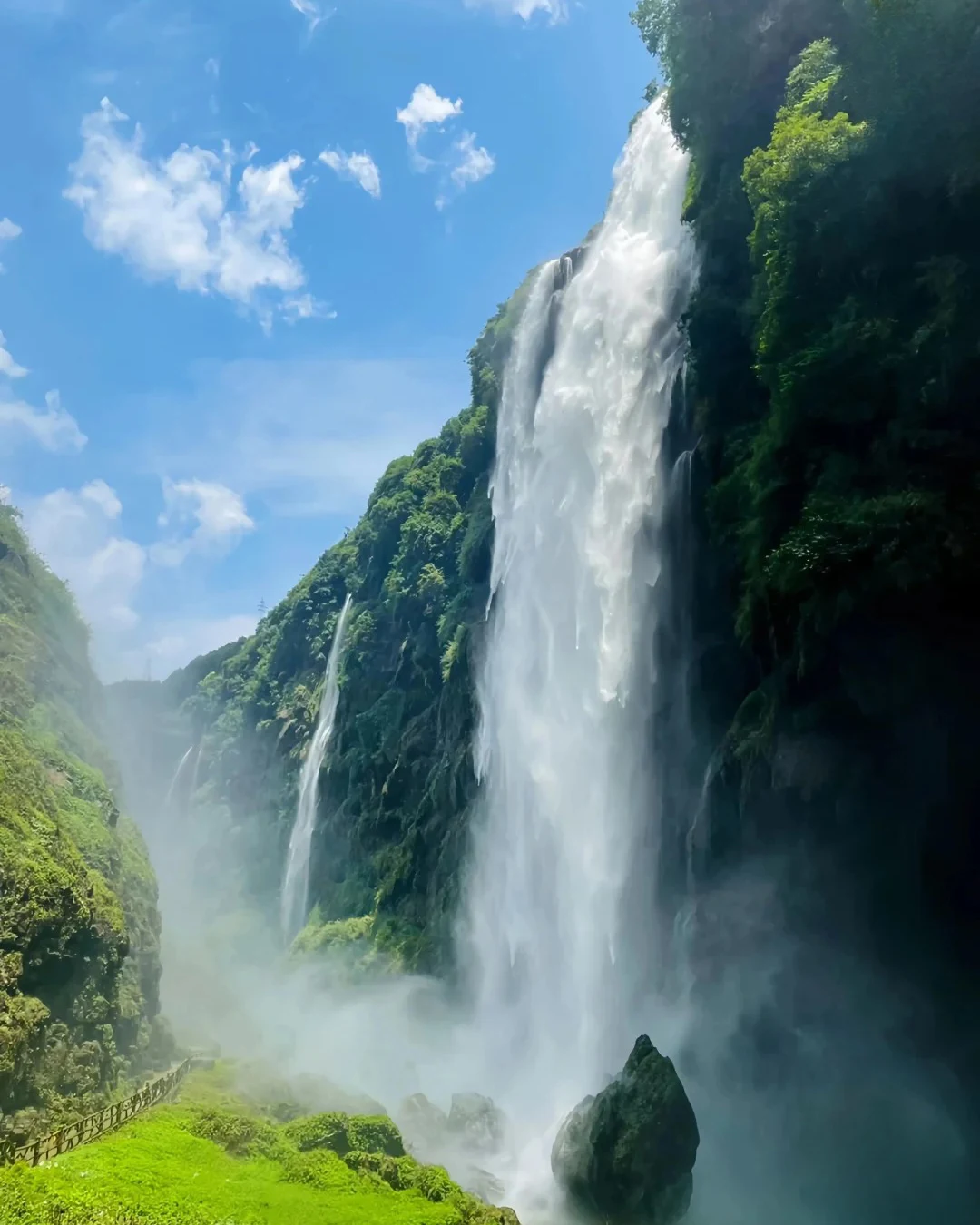 Dilanjutkan berfoto di Tianxing Bridge Scenic Area, yang menampilkan perpaduan indah antara bebatuan, pepohonan, dan sungai, serta mengunjungi Doupotang Waterfall, bagian terluas dari Huangguoshu (105 m), dijuluki “Air Terjun Menderu”.