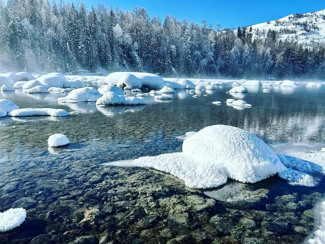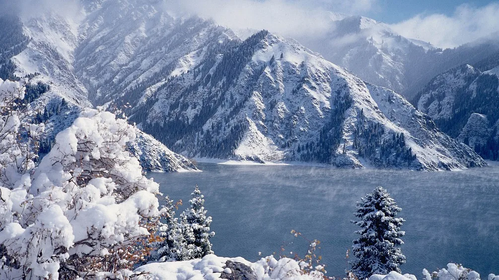Danau Kanas yang membeku di musim dingin dengan latar Pegunungan Altai.